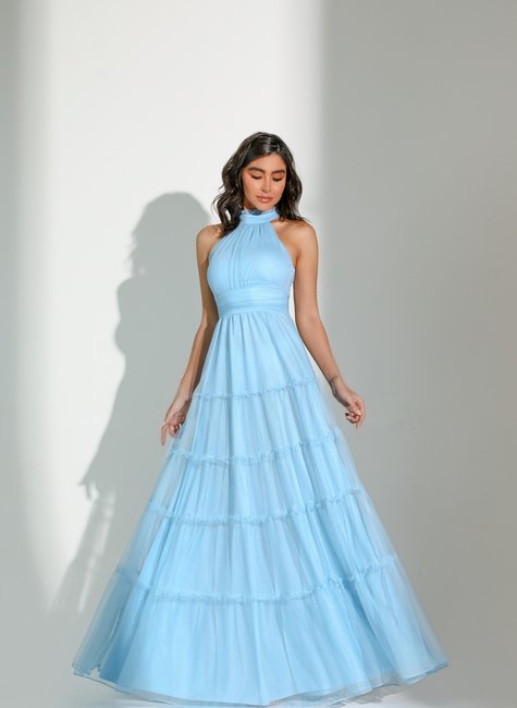 Este vestido de festa longo é uma peça encantadora confeccionada em microtule, conhecido por sua leveza e fluidez. A gola alta adiciona um toque de sofisticação, enquanto o design em camadas "Três Marias" oferece um efeito volumoso e elegante, ideal para quem busca um visual impactante. O vestido conta com um fechamento em zíper nas costas, garantindo um ajuste perfeito ao corpo. O forro proporciona conforto e proteção, evitando a transparência excessiva e mantendo a elegância da peça. As camadas são cuidadosamente distribuídas, permitindo liberdade de movimento e um caimento impecável.