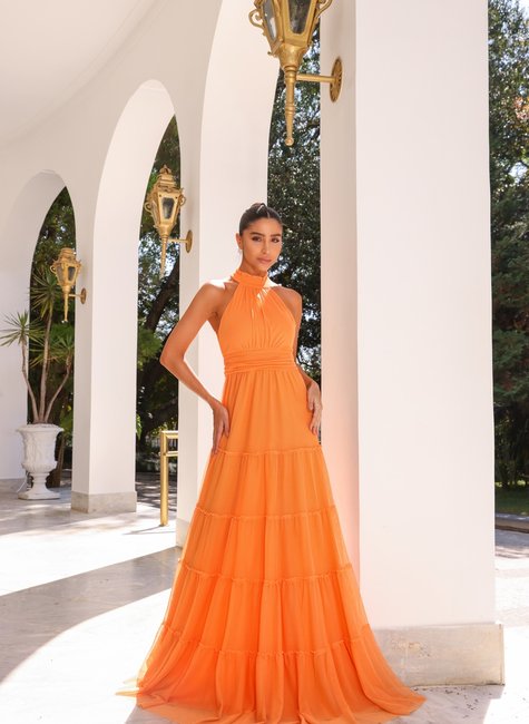 O vestido de festa longo com gola alta em microtule da DOT é uma peça deslumbrante e sofisticada. Seu design em camadas "Três Marias" confere movimento e leveza, criando um efeito etéreo ao se deslocar. A gola alta acrescenta um toque de elegância e modernidade, enquanto o microtule traz um aspecto delicado e romântico.