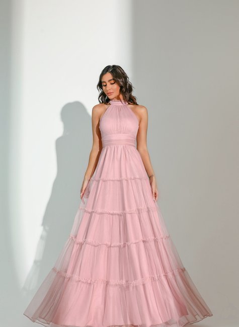 Este vestido de festa longo é uma peça encantadora confeccionada em microtule, conhecido por sua leveza e fluidez. A gola alta adiciona um toque de sofisticação, enquanto o design em camadas "Três Marias" oferece um efeito volumoso e elegante, ideal para quem busca um visual impactante. O vestido conta com um fechamento em zíper nas costas, garantindo um ajuste perfeito ao corpo. O forro proporciona conforto e proteção, evitando a transparência excessiva e mantendo a elegância da peça. As camadas são cuidadosamente distribuídas, permitindo liberdade de movimento e um caimento impecável.