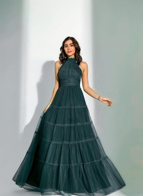 Este vestido de festa longo é uma peça encantadora confeccionada em microtule, conhecido por sua leveza e fluidez. A gola alta adiciona um toque de sofisticação, enquanto o design em camadas "Três Marias" oferece um efeito volumoso e elegante, ideal para quem busca um visual impactante. O vestido conta com um fechamento em zíper nas costas, garantindo um ajuste perfeito ao corpo. O forro proporciona conforto e proteção, evitando a transparência excessiva e mantendo a elegância da peça. As camadas são cuidadosamente distribuídas, permitindo liberdade de movimento e um caimento impecável.