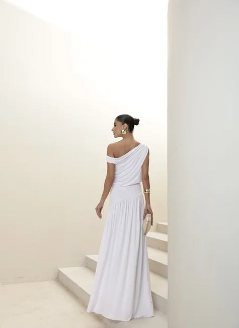 O drapeado na parte superior cria um efeito visual que valoriza o colo e equilibra a silhueta. A saia longa acompanha o movimento do corpo, garantindo leveza e elegância ao caminhar. Confeccionado em tecido jersey, macio, maleável e confortável.