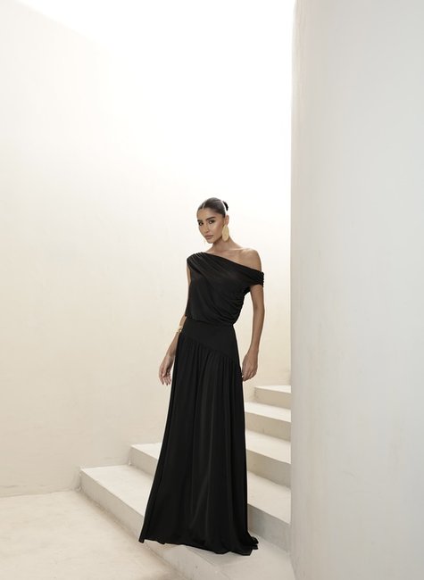 O drapeado na parte superior cria um efeito visual que valoriza o colo e equilibra a silhueta. A saia longa acompanha o movimento do corpo, garantindo leveza e elegância ao caminhar. Confeccionado em tecido jersey, macio, maleável e confortável.