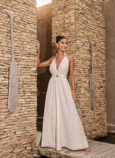 O vestido possui um design frente única, onde as alças se prendem ao pescoço, criando um decote halter que valoriza o colo e os ombros com delicadeza. Este estilo confere um ar de sofisticação e sensualidade na medida certa. O vestido destaca a silhueta, marcando a cintura de forma elegante e feminina. O destaque do design fica por conta das fivelas decorativas em formato de sol, posicionadas estrategicamente. Esses detalhes metálicos dourados trazem um toque de brilho e personalidade à peça, evocando um estilo marcante e diferenciado. confeccionado em um tecido ricamente bordado, com padrões intricados que remetem ao artesanato de luxo. Os bordados podem incluir detalhes florais, geométricos ou abstratos, adicionando textura e sofisticação ao visual. A saia longa possui um corte fluido, levemente evasê, que cria movimento e leveza. O tecido delicado garante um caimento impecável, ideal para eventos formais ou momentos especiais. As fivelas em formato de sol são exclusivas e adicionam um toque de originalidade ao design.