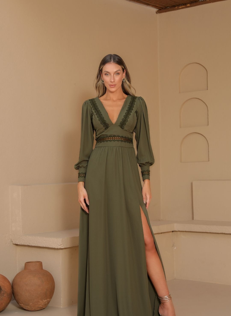 O decote em V acentuado é um detalhe que realça o colo de forma delicada, trazendo um toque de sensualidade sutil e ao mesmo tempo sofisticado. As mangas longas conferem um ar de classe e podem ser levemente ajustadas nos punhos, adicionando um toque de charme e refinamento. Os elementos em renda, que podem adornar o decote, as mangas ou a parte inferior do vestido, trazem uma textura rica e um visual romântico. A renda é delicada e confere um aspecto artesanal à peça, elevando sua sofisticação. A cintura é levemente ajustada, acentuando as curvas e criando uma silhueta feminina e elegante, enquanto a saia pode apresentar um corte evasê ou reto, garantindo conforto e liberdade de movimento. Possui uma fenda na lateral da saia dando um ar mais sensual a peça e seu fechamento é por zíper nas costas facilitando a vestimenta.