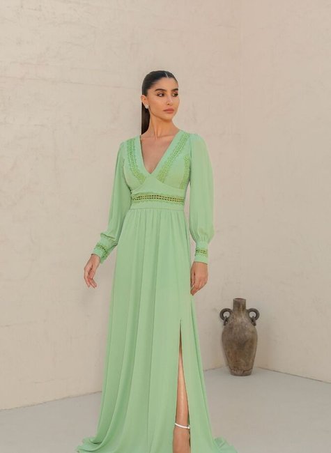 O vestido de festa com decote em V e mangas longas é uma peça que exala elegância e sofisticação, perfeita para ocasiões especiais. Confeccionado em um tecido fluido e de alta qualidade, ele proporciona um caimento deslumbrante que valoriza a silhueta.