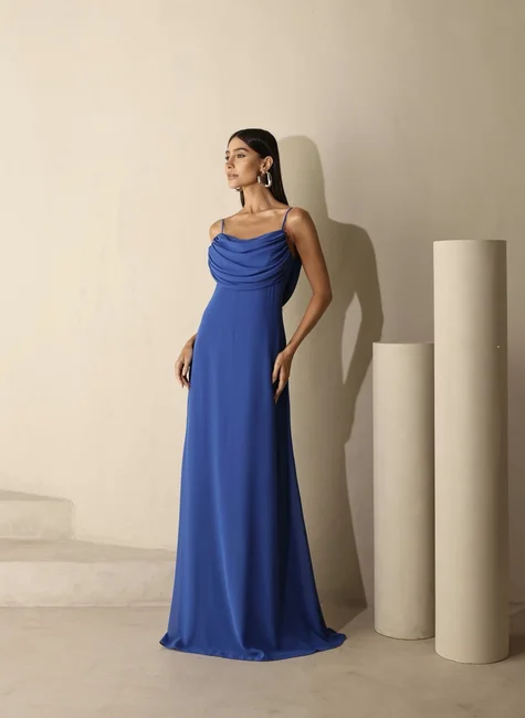 * O vestido possui comprimento longo com design atemporal, alças finas e delicadas que trazem leveza ao visual e um drapeado elegante tanto na parte frontal quanto nas costas. O detalhe especial fica por conta da parte traseira, que apresenta um decote profundo com acabamento em calda fluida, criando um movimento sofisticado e cheio de charme a cada passo.