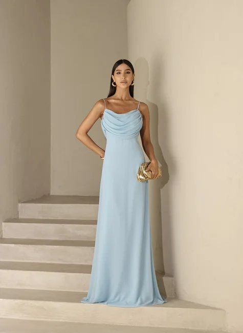 * O vestido possui comprimento longo com design atemporal, alças finas e delicadas que trazem leveza ao visual e um drapeado elegante tanto na parte frontal quanto nas costas. O detalhe especial fica por conta da parte traseira, que apresenta um decote profundo com acabamento em calda fluida, criando um movimento sofisticado e cheio de charme a cada passo.