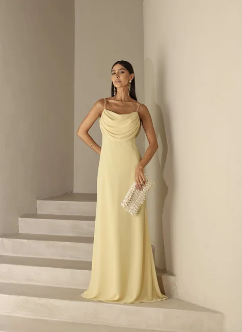 * O vestido possui comprimento longo com design atemporal, alças finas e delicadas que trazem leveza ao visual e um drapeado elegante tanto na parte frontal quanto nas costas. O detalhe especial fica por conta da parte traseira, que apresenta um decote profundo com acabamento em calda fluida, criando um movimento sofisticado e cheio de charme a cada passo.