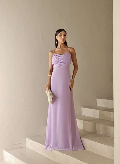 * O vestido possui comprimento longo com design atemporal, alças finas e delicadas que trazem leveza ao visual e um drapeado elegante tanto na parte frontal quanto nas costas. O detalhe especial fica por conta da parte traseira, que apresenta um decote profundo com acabamento em calda fluida, criando um movimento sofisticado e cheio de charme a cada passo.