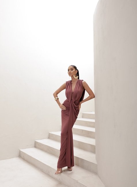 Seu decote profundo em V alonga a silhueta e traz um toque de glamour. O drapeado frontal com torção na cintura cria um efeito que afina e modela o corpo, enquanto a fenda estratégica garante movimento e leveza ao caminhar.