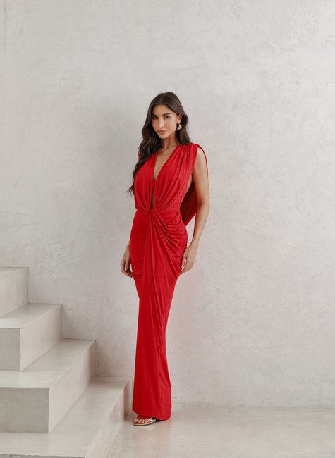 Seu decote profundo em V alonga a silhueta e traz um toque de glamour. O drapeado frontal com torção na cintura cria um efeito que afina e modela o corpo, enquanto a fenda estratégica garante movimento e leveza ao caminhar.