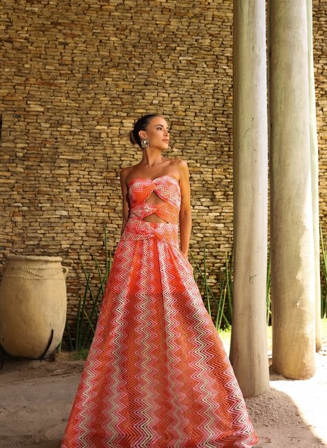 Decote tomara que caia que valoriza o colo de forma elegante e feminina, proporcionando um visual delicado e sensual. Estrutura firme com suporte interno, garantindo segurança e conforto ao vestir. O busto apresenta um charmoso detalhe em nó, que agrega sofisticação e modernidade ao design. Modelagem pensada para valorizar as curvas de maneira sutil e elegante. Confeccionado em renda de estilo Missoni, com padrão exclusivo que une delicadeza e personalidade. Tecido leve e fluido que proporciona movimento e um caimento perfeito. Forro interno para garantir conforto e opacidade, mantendo o charme da transparência sutil da renda. Saia fluida e alongada, que traz elegância e destaca a silhueta de maneira sofisticada. Ideal para ocasiões formais, conferindo um toque de glamour ao look.