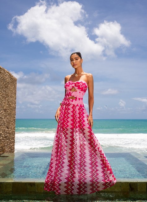 Decote tomara que caia que valoriza o colo de forma elegante e feminina, proporcionando um visual delicado e sensual. Estrutura firme com suporte interno, garantindo segurança e conforto ao vestir. O busto apresenta um charmoso detalhe em nó, que agrega sofisticação e modernidade ao design. Modelagem pensada para valorizar as curvas de maneira sutil e elegante. Confeccionado em renda de estilo Missoni, com padrão exclusivo que une delicadeza e personalidade. Tecido leve e fluido que proporciona movimento e um caimento perfeito. Forro interno para garantir conforto e opacidade, mantendo o charme da transparência sutil da renda. Saia fluida e alongada, que traz elegância e destaca a silhueta de maneira sofisticada. Ideal para ocasiões formais, conferindo um toque de glamour ao look.