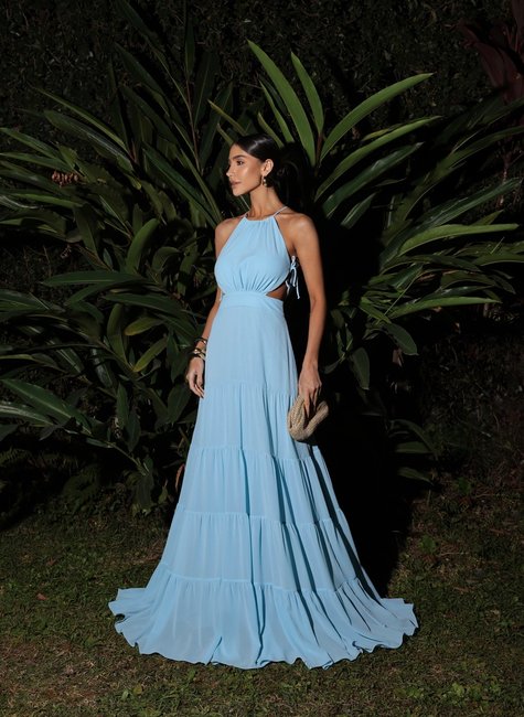 A saia longa com camadas amplas proporciona um caimento impecável e um visual etéreo, ideal para ocasiões especiais como casamentos, festas, eventos ao ar livre ou até mesmo um jantar mais refinado.
