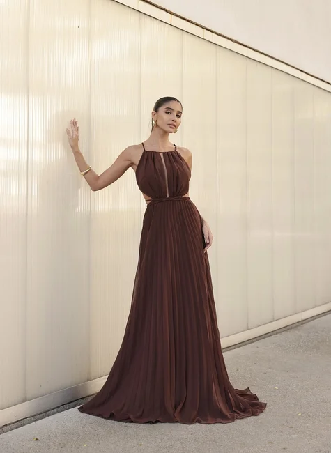 Confeccionado em tecido leve e fluido com plissado por toda a extensão, proporcionando movimento e sofisticação. Decote halter com recorte central sutil, que alonga a silhueta e valoriza o colo. Alças finas com acabamento em trancinha, que se conectam ao destaque principal nas costas. Costas com design trançado, revelando parte da pele de maneira delicada e elegante. Cintura marcada por uma faixa embutida no próprio tecido, que desenha o corpo e traz proporção ao look. Saia longa com fluidez intensa, ideal para criar presença em eventos especiais.