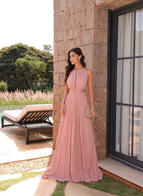 Confeccionado em tecido leve e fluido com plissado por toda a extensão, proporcionando movimento e sofisticação. Decote halter com recorte central sutil, que alonga a silhueta e valoriza o colo. Alças finas com acabamento em trancinha, que se conectam ao destaque principal nas costas. Costas com design trançado, revelando parte da pele de maneira delicada e elegante. Cintura marcada por uma faixa embutida no próprio tecido, que desenha o corpo e traz proporção ao look. Saia longa com fluidez intensa, ideal para criar presença em eventos especiais.