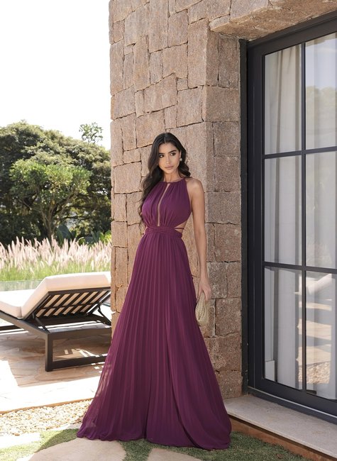 Confeccionado em tecido leve e fluido com plissado por toda a extensão, proporcionando movimento e sofisticação. Decote halter com recorte central sutil, que alonga a silhueta e valoriza o colo. Alças finas com acabamento em trancinha, que se conectam ao destaque principal nas costas. Costas com design trançado, revelando parte da pele de maneira delicada e elegante. Cintura marcada por uma faixa embutida no próprio tecido, que desenha o corpo e traz proporção ao look. Saia longa com fluidez intensa, ideal para criar presença em eventos especiais.