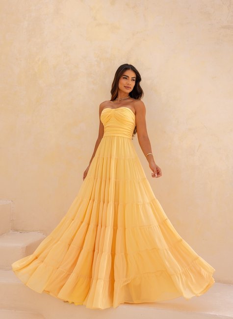 Confeccionado em crepe leve e fluido, proporcionando um toque macio e um caimento esvoaçante. Camadas delicadas que dão movimento à peça, criando um efeito elegante e sofisticado. Sem alça, destacando os ombros e proporcionando um visual sofisticado e feminino. Elástico ou estrutura na parte superior, garantindo segurança e ajuste perfeito ao corpo. Comprimento longo, trazendo um toque clássico e refinado ao look. Camadas leves que proporcionam um efeito fluido e cheio de charme ao caminhar.