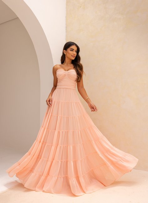 Confeccionado em crepe leve e fluido, proporcionando um toque macio e um caimento esvoaçante. Camadas delicadas que dão movimento à peça, criando um efeito elegante e sofisticado. Sem alça, destacando os ombros e proporcionando um visual sofisticado e feminino. Elástico ou estrutura na parte superior, garantindo segurança e ajuste perfeito ao corpo. Comprimento longo, trazendo um toque clássico e refinado ao look. Camadas leves que proporcionam um efeito fluido e cheio de charme ao caminhar.