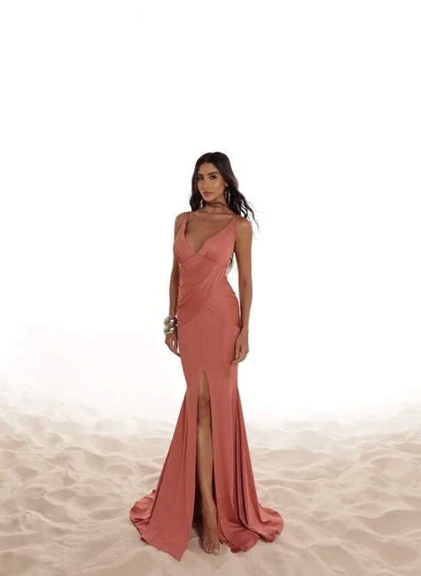 * O decote em V profundo alonga a silhueta e valoriza o colo com elegância. A modelagem ajustada ao corpo cria o efeito sereia, destacando a cintura e o quadril antes de abrir suavemente na barra, proporcionando movimento e fluidez ao caminhar.