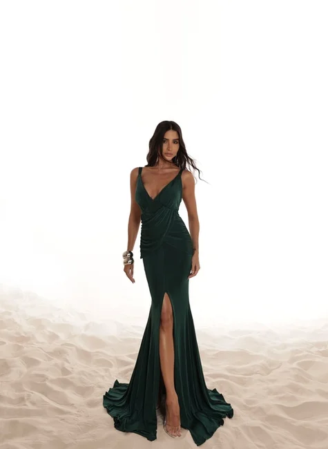 * O decote em V profundo alonga a silhueta e valoriza o colo com elegância. A modelagem ajustada ao corpo cria o efeito sereia, destacando a cintura e o quadril antes de abrir suavemente na barra, proporcionando movimento e fluidez ao caminhar.
