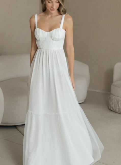 Este vestido é uma peça versátil que pode ser facilmente combinado com acessórios statement, como brincos e pulseiras, para um look deslumbrante. Ideal para dançar a noite toda, ele traz um ar romântico e contemporâneo. Pode ser também usado no seu dia especial de casamento!
