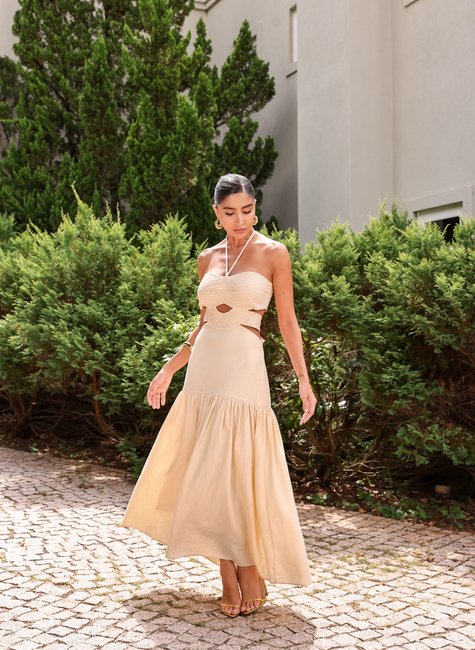 Este vestido longuete é uma peça encantadora que une elegância, modernidade e um toque de sensualidade em um design sofisticado.