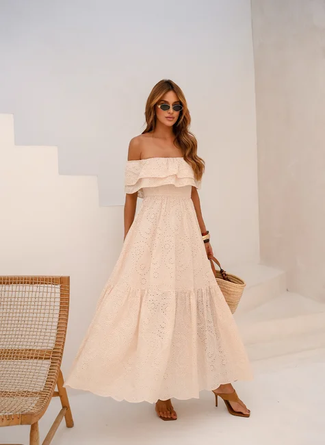 O Vestido Longuete Laise Ombro a Ombro DOT é a escolha perfeita para quem busca sofisticação e frescor em um só look. Confeccionado em tecido de laise bordada, possui detalhes delicados em arabescos vazados que trazem leveza e romantismo à peça. Seu design ombro a ombro com babado duplo valoriza o colo feminino de forma elegante e charmosa, enquanto a modelagem longuete evasê proporciona movimento fluido e caimento impecável.