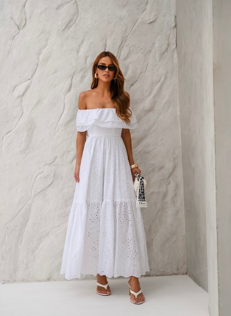 O Vestido Longuete Laise Ombro a Ombro DOT é a escolha perfeita para quem busca sofisticação e frescor em um só look. Confeccionado em tecido de laise bordada, possui detalhes delicados em arabescos vazados que trazem leveza e romantismo à peça. Seu design ombro a ombro com babado duplo valoriza o colo feminino de forma elegante e charmosa, enquanto a modelagem longuete evasê proporciona movimento fluido e caimento impecável.
