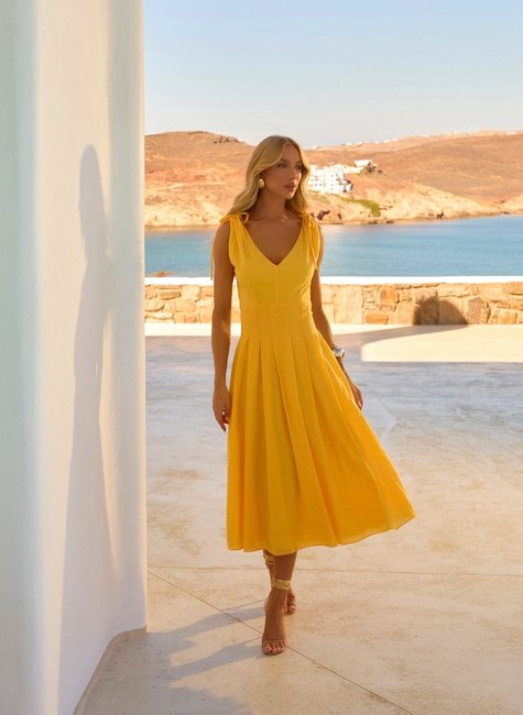 Com um corte midi, o vestido atinge uma altura que valoriza as pernas, enquanto as pregas na saia proporcionam um caimento fluido e delicado. O detalhe das tiras que amarram nos ombros adiciona um toque especial, permitindo que você ajuste a peça conforme sua preferência e destaque a região dos ombros de forma charmosa.  As pregas cuidadosamente distribuídas na saia não apenas adicionam volume, mas também criam um efeito visual interessante que valoriza a silhueta. As tiras que amarram nos ombros são uma característica distintiva, permitindo um ajuste personalizado e oferecendo uma opção de styling que é ao mesmo tempo prática e estilosa.