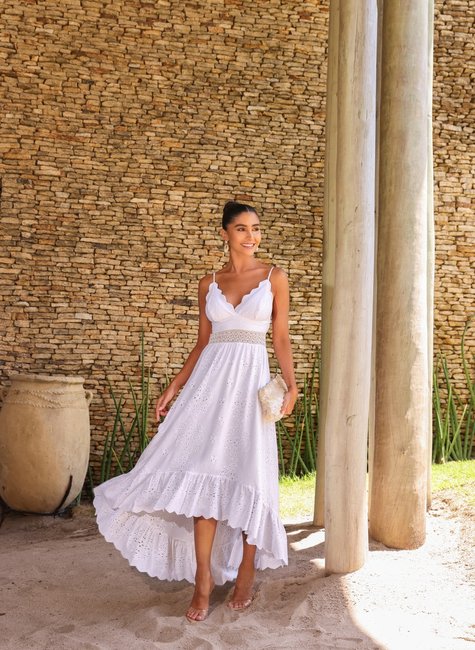 Este vestido apresenta um corte mulet, que é caracterizado pela parte da frente mais curta e a parte de trás mais longa, criando um efeito assimétrico deslumbrante. A silhueta é leve e fluida, proporcionando um movimento gracioso a cada passo. O decote é delicado e realça o colo, enquanto a modelagem ajustada na parte superior acentua a cintura, valorizando as curvas femininas. Confeccionado em linho de alta qualidade, o vestido é respirável e ideal para climas quentes. O linho traz um toque natural e sofisticado, enquanto o bordado adiciona uma camada extra de detalhe e textura, tornando a peça única e encantadora. O conforto é garantido pelo caimento leve do tecido, que permite liberdade de movimento.