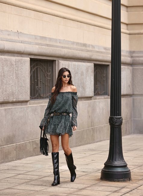 O vestido possui modelagem fluida e soltinha, com caimento leve e movimento natural. A cintura é ajustável com elástico, permitindo conforto e versatilidade. O decote ombro a ombro é delicadamente estruturado com elástico, trazendo charme e feminilidade, enquanto as mangas longas com babados garantem um toque romântico e sofisticado. A saia com camadas e leve volume complementa a proposta boho com elegância. Confeccionado em crepe leve estampado, o tecido proporciona ótimo caimento e toque suave na pele. A estampa animal print dá personalidade à peça, sem perder a elegância. É um material respirável e ideal para todas as estações.