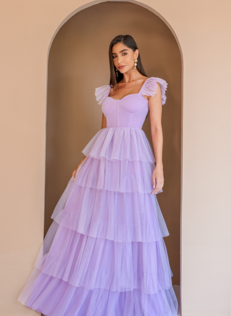 Confeccionado em tule de alta qualidade, o vestido apresenta uma textura leve e arejada, que proporciona um caimento fluido e gracioso. O tule é conhecido por sua leveza e transparência, permitindo a criação de camadas que adicionam volume e movimento ao look. A combinação do tule com outros tecidos de alta qualidade resulta em um visual encantador e delicado. O vestido possui uma silhueta longa que se adapta ao corpo, valorizando as curvas femininas de maneira sofisticada. O busto estilo corset é um dos grandes destaques do modelo, oferecendo um suporte incrível e moldando a silhueta de forma elegante. Esse detalhe não só cria um visual refinado, mas também proporciona conforto e segurança ao vestir. As camadas de tule são o elemento mágico deste vestido, criando um efeito volumoso e etéreo que flui com graça ao longo da saia. Cada camada é cuidadosamente confeccionada, permitindo que o vestido ganhe movimento e leveza, tornando-o ideal para dançar e se divertir. O design em camadas também adiciona profundidade e textura ao look, tornando-o ainda mais encantador. A cintura levemente ajustada realça a forma feminina, enquanto o forro interno proporciona conforto e evita transparências indesejadas, permitindo que você se sinta à vontade durante todo o evento.