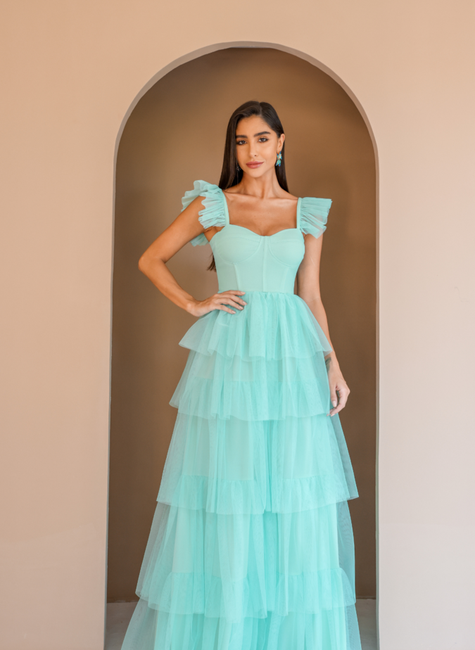 Confeccionado em tule de alta qualidade, o vestido apresenta uma textura leve e arejada, que proporciona um caimento fluido e gracioso. O tule é conhecido por sua leveza e transparência, permitindo a criação de camadas que adicionam volume e movimento ao look. A combinação do tule com outros tecidos de alta qualidade resulta em um visual encantador e delicado. O vestido possui uma silhueta longa que se adapta ao corpo, valorizando as curvas femininas de maneira sofisticada. O busto estilo corset é um dos grandes destaques do modelo, oferecendo um suporte incrível e moldando a silhueta de forma elegante. Esse detalhe não só cria um visual refinado, mas também proporciona conforto e segurança ao vestir. As camadas de tule são o elemento mágico deste vestido, criando um efeito volumoso e etéreo que flui com graça ao longo da saia. Cada camada é cuidadosamente confeccionada, permitindo que o vestido ganhe movimento e leveza, tornando-o ideal para dançar e se divertir. O design em camadas também adiciona profundidade e textura ao look, tornando-o ainda mais encantador. A cintura levemente ajustada realça a forma feminina, enquanto o forro interno proporciona conforto e evita transparências indesejadas, permitindo que você se sinta à vontade durante todo o evento.